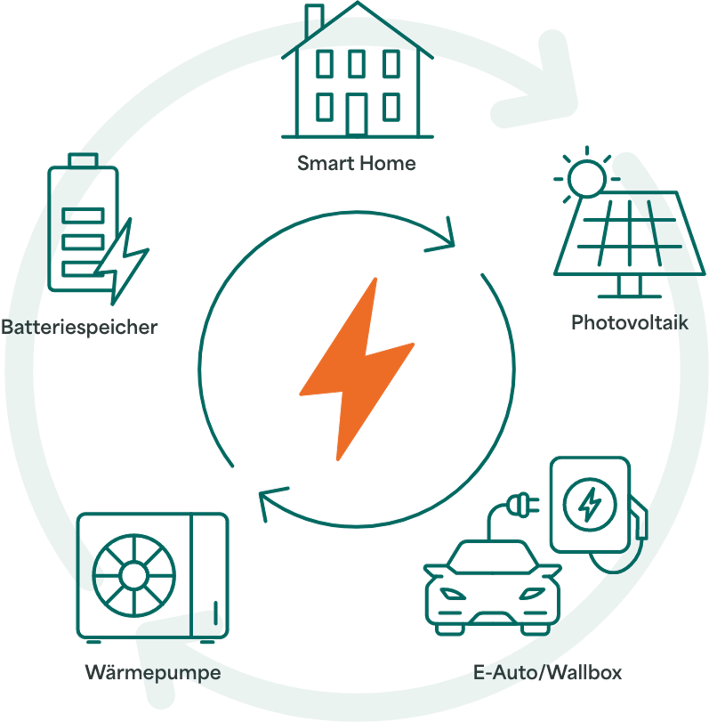 Das Home Energie Management (HEMS) verbindet Photovoltaik, Batteriespeicher, Wärmepumpe, E-Auto/Wallbox und Ihr Smart Home zu einem intelligenten Kreislauf.